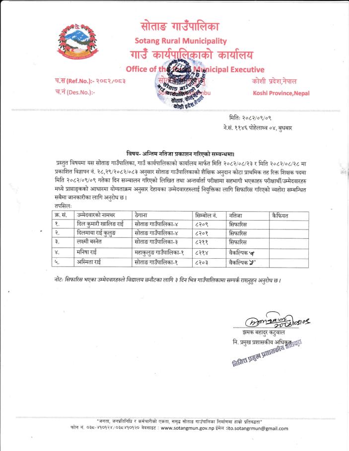गाउँपालिका शैक्षिक अनुदान कोटा,प्राथमिक तह, शिक्षक पदको परिक्षाको विज्ञापन -२०८२