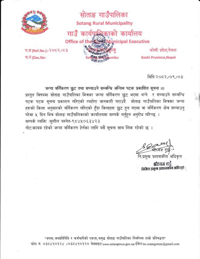 जग्गा बर्गिकरण छुट तथा सच्याउने सम्बन्धि अन्तिम पटक प्रकाशित सूचना !!!