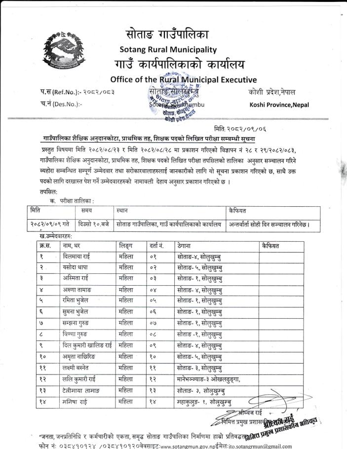 गाउँपालिका शैक्षिक अनुदान कोटा,प्राथमिक तह, शिक्षक पदको परिक्षाको विज्ञापन -२०८२